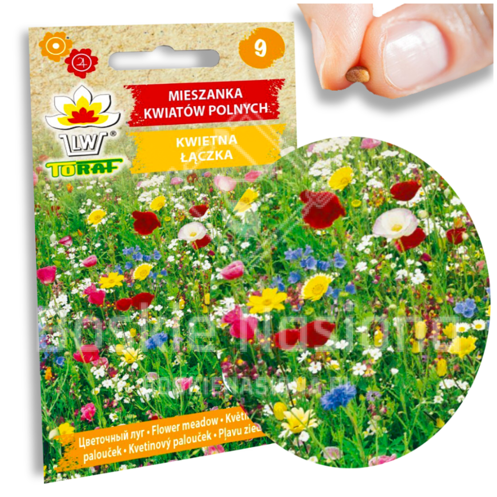 Wyjątkowa kompozycja mało wymagających, kolorowo kwitnących roślin jednorocznych i wieloletnich. W skład mieszanki wchodzi ponad 40 gatunków kwiatów dziko występujących w zbiorowiskach śródpolnych. Ta mieszanka może stać się znakomitym dodatkiem do traw tworząc łąkę kwietną. Kwiaty zostały dobrane tak, aby cieszyć oko przez cały okres wegetacji – od wczesnego lata do późnej jesieni. Wysiew nasion do połowy III do V, rzutowo, używając około 1g na m2. Przy mieszaniu nasion z trawą używaj 3g mieszanki kwiatów polnych na 100g nasion trawy.